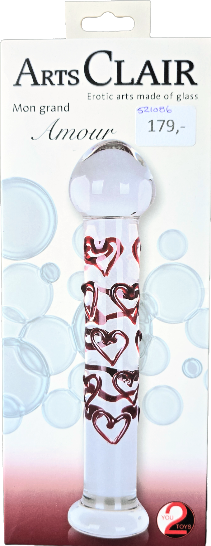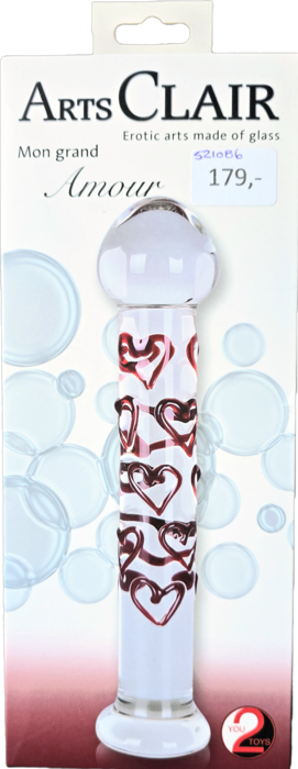 Smuk glas dildo med penishoved, røde hjerter på skaftet og med en lille fod.