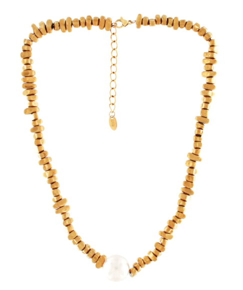 Halskæden består af en masse guldbelagte perler, der har forskellige størrelser. Hullerne i perlerne sidder ikke lige i midten hver gang, så der er virkelig spil i denne halskæde.