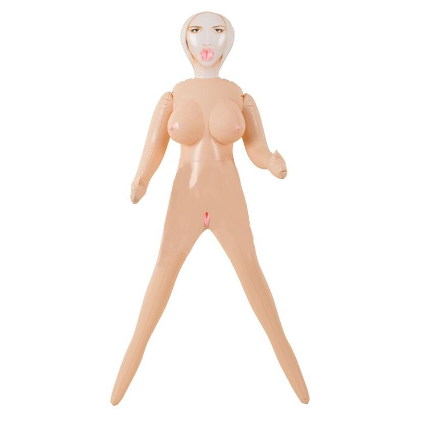 Med tre stramme huller, mund, vagina og anal. Ansigt og hår i realistisk fotoprint.