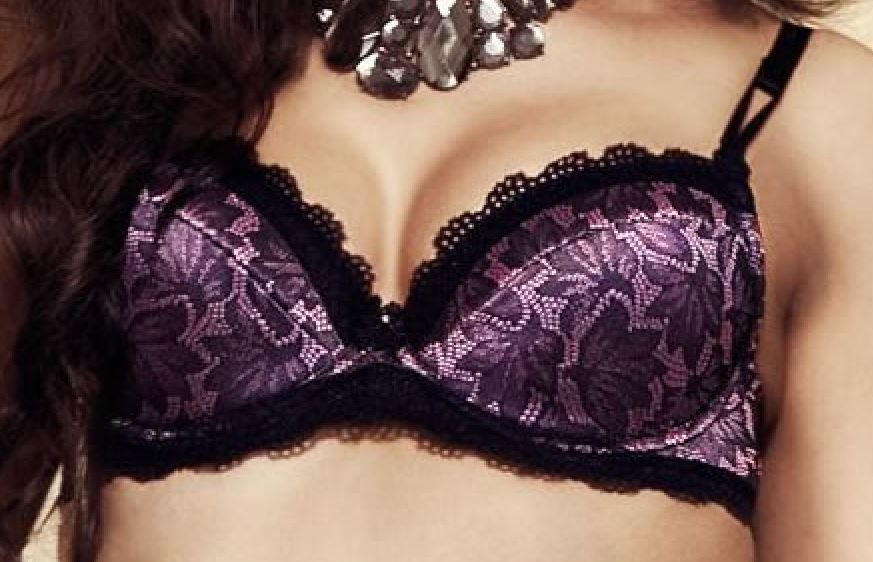 Stoffet er en kombination af sort og en smuk støvet lilla i et flot mønster. Der er brede sorte blondekanter på underkanten af BH'en og i BH'ens udskæring.